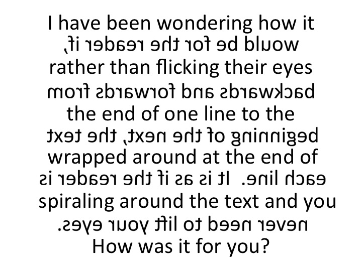 Then I got to thinking about how, when we write, we only write in a single direction – from left to right – and that the reader is forced to flick their attention from the end of one line to the beginning of the next.  I’m very curious about discontinuities like this and hypothesise that a steady tracking of text – especially if it balances right to left as well as left to right – would result in some kind of smoother comprehension.